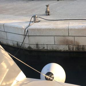 Sweet cat wanting to come on board. We had to remove our plank. Sorry Kitty.